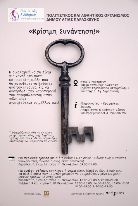 Ο Πολιτιστικός και Αθλητικός Οργανισμός Δήμου Αγίας Παρασκευής (ΠΑΟΔΑΠ), διοργανώνει ένα ξεχωριστό θεματικό δωμάτιο απόδρασης (escape room), με τίτλο «Κρίσιμη Συνάντηση!». Η δράση έχει εκπαιδευτικό σκοπό μέσω της ψυχαγωγίας και απευθύνεται σε παιδιά, εφήβους και ενηλίκους.