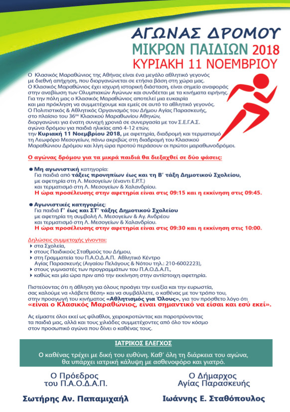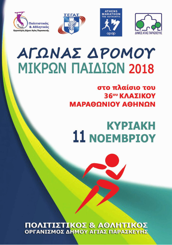 Ο Πολιτιστικός και Αθλητικός Οργανισμός του Δήμου Αγίας Παρασκευής στο πλαίσιο του 36ουΚλασικού Μαραθωνίου Αθηνών, διοργανώνει την Κυριακή 11 Νοεμβρίου 2018 σε συνεργασία με τον ΣΕΓΑΣ «Αγώνα Δρόμου Μικρών Παιδιών» ηλικίας 4-12 ετών, ως εξής: